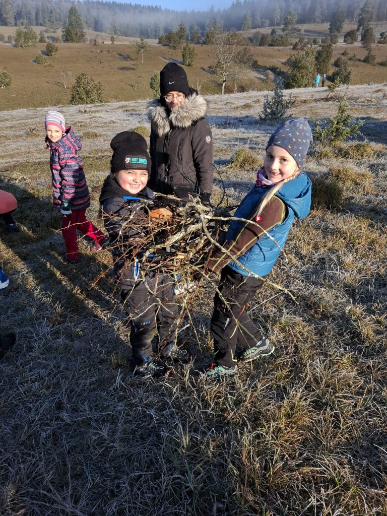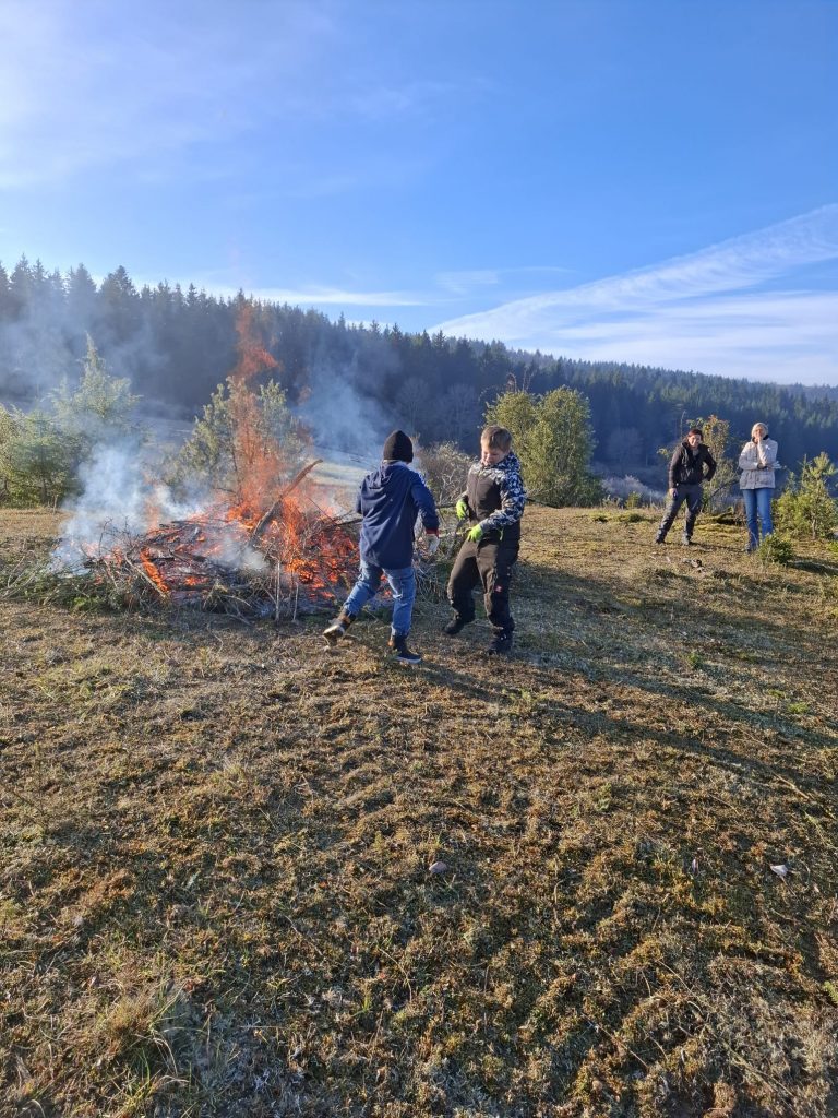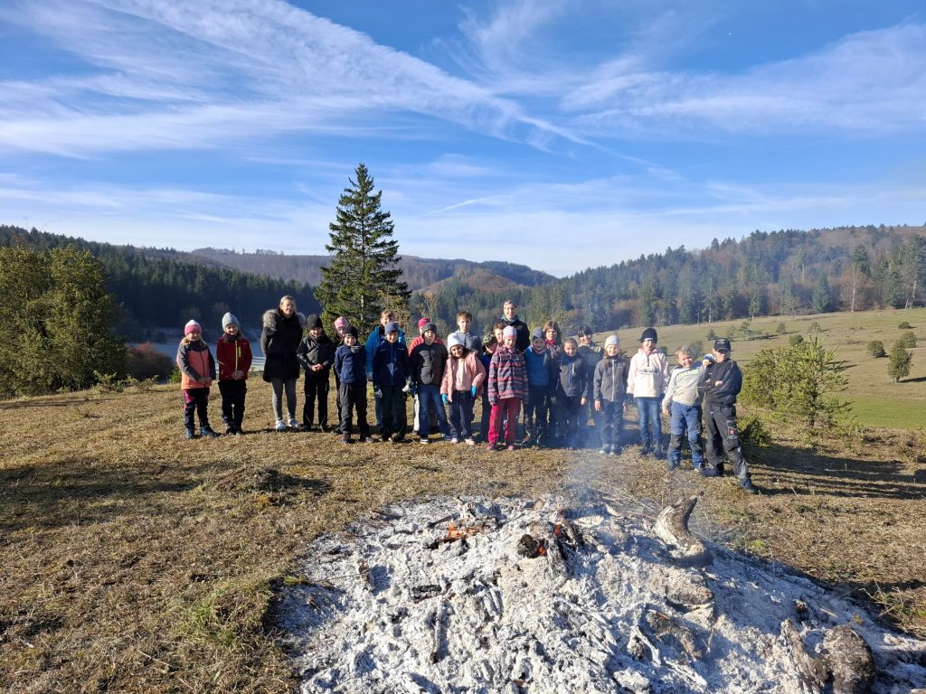 Am Parkplatz wartete schon unsere Förster Ferdinand Neumann mit seinem Hund Luigi auf uns. Man sah von oben schon die Feuer brennen an denen wir arbeiten sollten. Das Feuer für Klasse 1 war ganz vorne, unseres für Klasse 4 war ganz hinten. Auf dem Weg zu dem Feuer trafen wir auch die Rangerin Insa und Gabriel. Sie halfen uns auch beim Digelfeldtag. Am Feuer warteten schon Eltern aus unserer Klasse auf uns. Frau Walzer erklärte uns auf was wir achten mussten, dann ging es los. Wir fingen in unserem Bereich an und sammelten Holz und warfen es ins Feuer. Es war sehr anstrengend, denn wir mussten weit laufen bis wir an das Holz und die Äste kamen. In diesem Jahr gab es sehr viel Geäst mit Dornen. Deshalb trugen wir Lederhandschuhe. Nach 50 Minuten gab es zwanzig Minuten Vesperpause. In der Pause kam Herr Baier mit seinem schwarzen Fendt mit Greifzange und half uns. Er lud viele dornige und stachelige Äste vom Wegrand auf und warf sie ins Feuer. Es rauchte richtig gut. Am Ende der Pause bekamen wir von Frau Walzer ein Bonbon für den zweiten Teil. Dann packten alle nochmals an. Die Wacholderzweige knisterten, wenn man sie ins Feuer warf. Als wir fertig waren, trafen sich alle Klassen bei den Feuern von Klasse 1 und 2. Wir hatten Spielzeit und spielten „Faules Ei“ , „Fangi“ und „Verstecken“. Die Eltern grillten solange für uns. Es gab zur Belohnung für jeden eine rote Wurst im Wecken mit Ketschup oder Senf. Es gab auch Geflügelrote für die Kinder, die kein Schwein essen durften. Danach machten wir einen Abschlusskreis und bedankten uns bei allen Helferinnen und Helfern. Herr Neumann war stolz auf uns, dass wir so viel geschafft hatten. Anschließend liefen wir gemeinsam zurück an die Schule. Es war ein sehr cooler Tag. Es machte sehr viel Spaß. Schade, dass es unser letzter Digelfeldtag war, weil wir nächstes Jahr an einer anderen Schule sind.