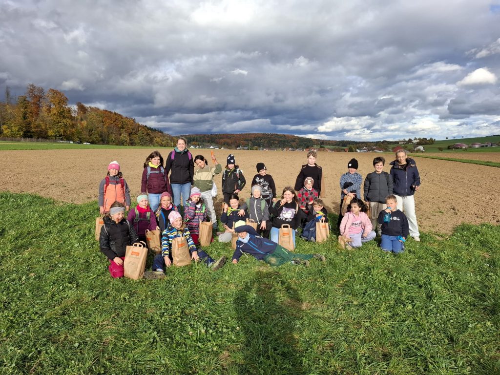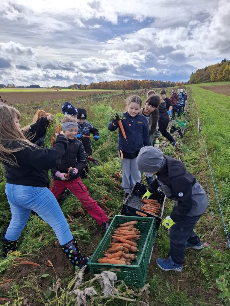 Am Dienstagmittag, dem 21.10.2025, besuchte die Klasse 3 gemeinsam mit ihrer Klassenlehrerin Frau Bendel und der FSJlerin Leyla den Gemüseacker der Familie König in Ehestetten. Dort halfen die Kinder tatkräftig bei der Karottenernte und erfuhren dabei viel über den Gemüseanbau. Mit großer Begeisterung zogen sie die frisch gewachsenen Karotten aus der Erde.