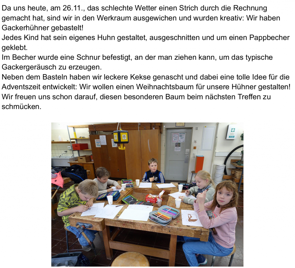 Nach den Ferien ging es heute wieder los, allerdings in einer neuen Gruppe. Zuerst haben wir uns um die Hühner gekümmert. Anfangs waren die Kinder noch etwas zurückhaltend, aber dann wurden sie mutiger und fütterten die Hühner sogar von der Hand aus – ein toller Moment für alle!