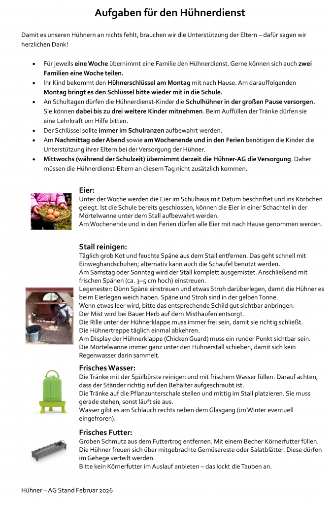 In dieser Woche habe ich Hühnerdienst. Immer zwei Kinder übernehmen den Hühnerdienst und kümmern sich von Montag bis Montag um die Hühner. In der Pause gehe ich mit zwei anderen Kindern das erste Mal ins Hühnergehege. Die Hühner sind schon so an uns gewöhnt, dass sie sich sehr freuen, und gleich auf uns zu gerannt kommen. Wir geben den Hühnern sauberes und frisches Wasser und füllen den Futtertrog im Stall. Besonders gerne mögen unsere Hühner auch mitgebrachte Gemüsereste. Danach kehren wir noch die Treppe zur „Hühnerbude“ ab, damit unsere Hühner einen sauberen Eingang haben. „Hühnerbude“, so haben wir unseren Stall benannt. Alle durften darüber mit abstimme. Unser „Chicken-Guard“ schließt und öffnet die Eingangstür zur „Hühnerbude“ automatisch. Hier überprüfe ich noch kurz die richtige Einstellung. Und nun kommt das Spannendste: Wir kontrollieren die Lege-Nester und schauen nach, ob Eier darin liegen. Diese nehmen wir aus den Nestern und schreiben mit einem Bleistift das Datum darauf. Sie kommen in unseren Hühnerkorb im Schulhaus. Gegen eine kleine Spende dürfen die Kinder der Schule Eier mit nachhause nehmen. Nach der Pause geht es wieder in den Unterricht. Jeden Nachmittag komme ich noch einmal mit meiner ganzen Familie zum Hühnerstall. Wir befreien die Lege-Nester vom Kot und misten die Kot-Ecken der Hühner. Das ist meistens der Bereich unter den Sitzstangen, denn darauf sitzen sie gerne in der Nacht. Am Wochenende misten wir den gesamten Stall aus. Das ist immer ein riesen Spaß und die ganze Familie kann mit anpacken. Haben die Hühner am Wochenende Eier gelegt, dürfen wir sie sogar mit nachhause nehmen.